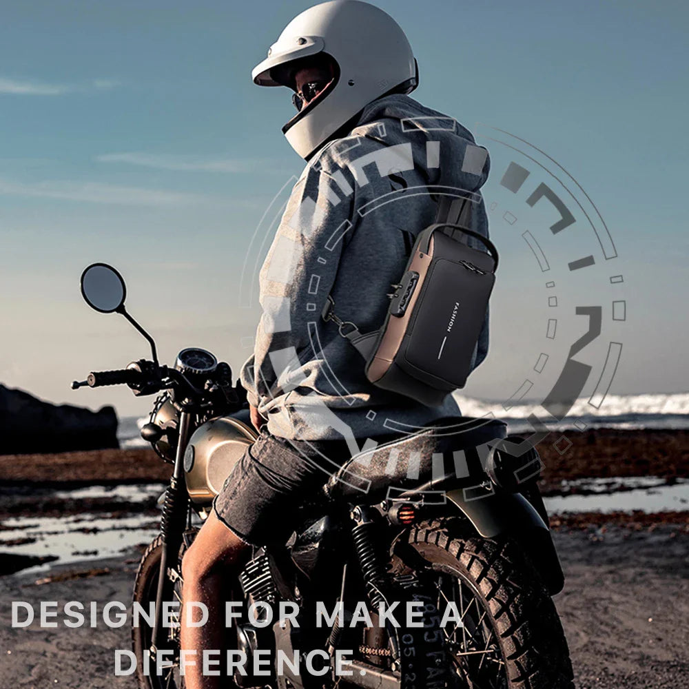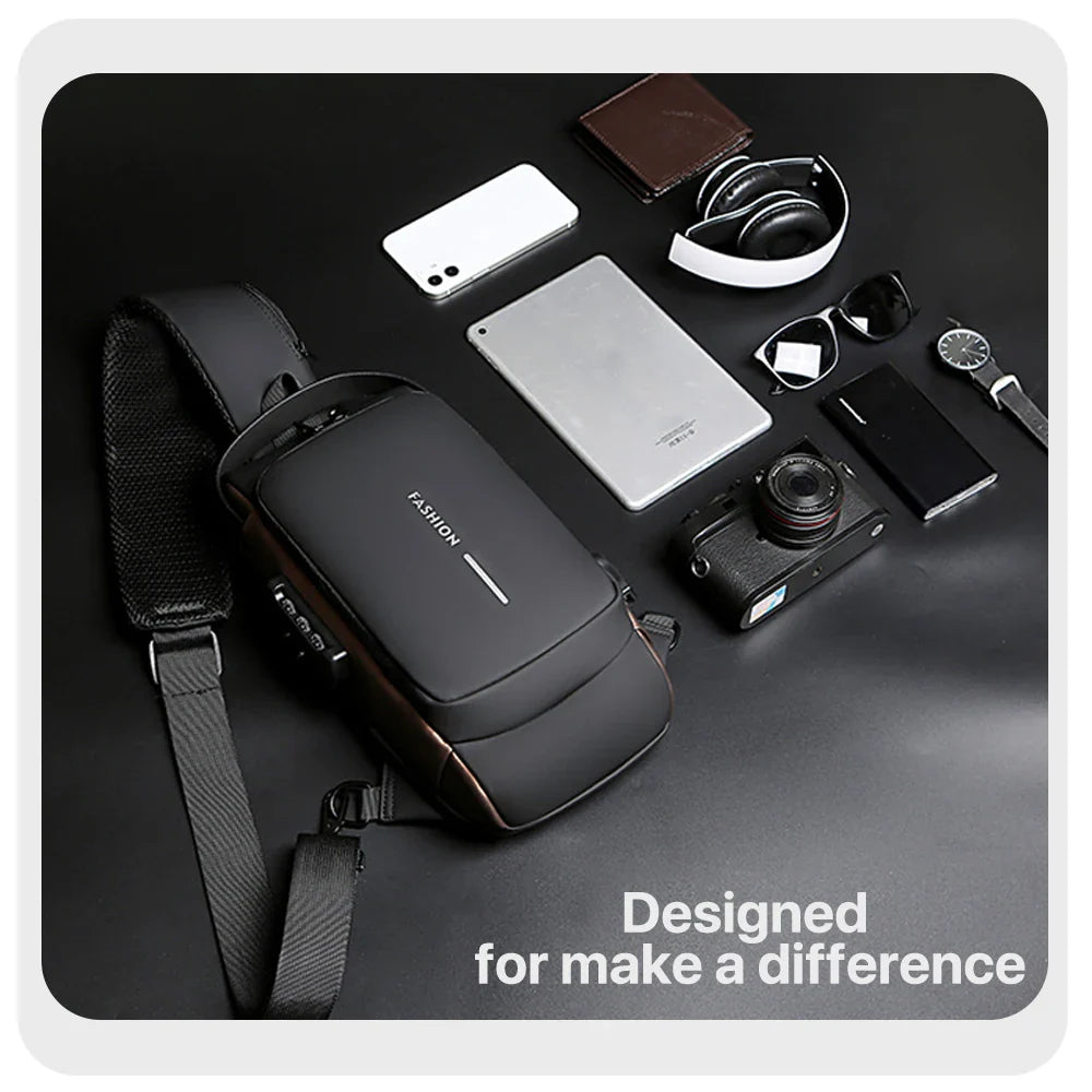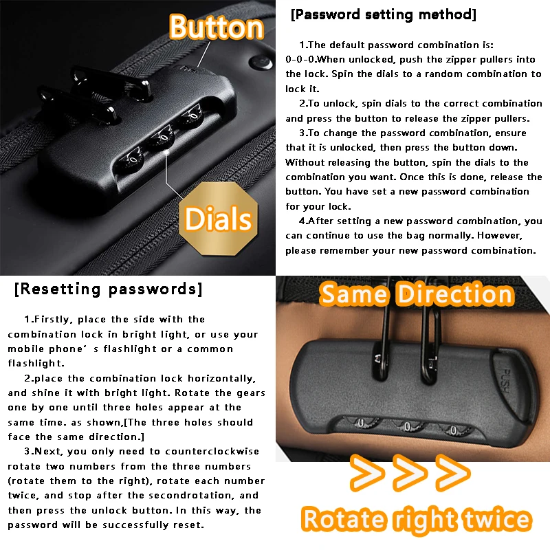 The default password combination is: 0-0-0. When unlocked, push the zipper pullers into the lock. Spin the dials to a random combination to lock it.