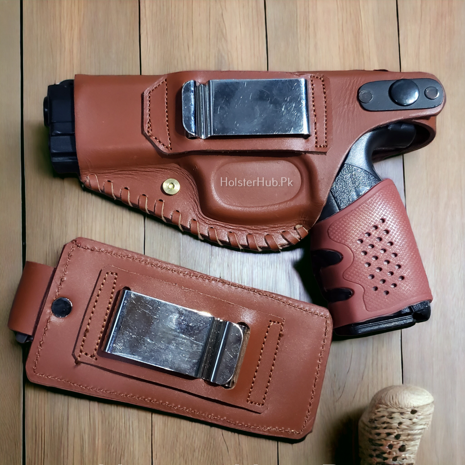 Introducing our Mold Holster for 9mm, crafted from premium pure leather – a perfect fusion of style and functionality. Designed for comfort and convenience, this holster seamlessly fits on your pant, belt, or shalwar. HOLSTER HUB proudly presents an elegant solution for discreetly carrying your essentials. Elevate your everyday carry with our meticulously crafted leather holsters, exclusively available for our Pakistani customers. Experience sophistication and practicality at HOLSTER HUB, where quality meets style.